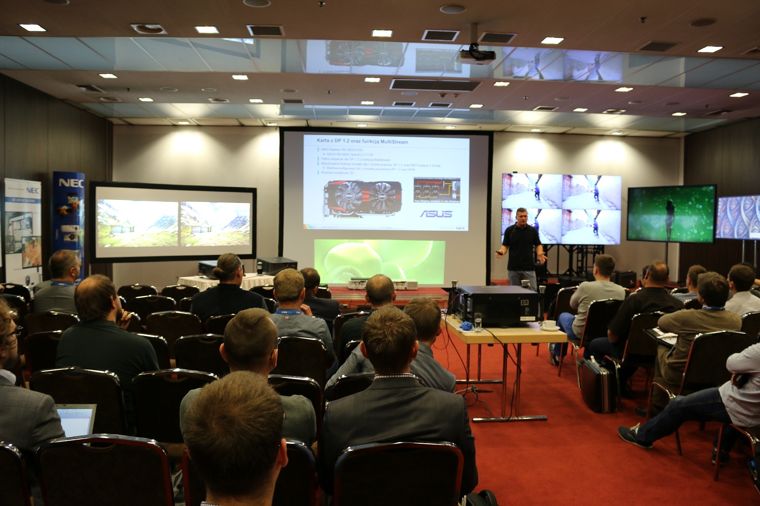 Wykłady NEC skupiały się w większości na produktach, które dopiero pojawią się w portfolio producenta lub są najczęściej wybieranymi rozwiązaniami przez integratorów AV. Zaprezentowane zostały nowości: laserowe projektory instalacyjne PX602UL, PX602WL, dotykowe monitory wielkoformatowe wyposażone w technologię Shadow Sense, monitory 4K od 24 do 98” oraz wiele innych ciekawych produktów. Jedną z ciekawszych prezentacji była ta, poświęcona bardzo popularnemu tematowi ścian wideo. Uczestnicy poza samymi produktami NEC przeznaczonymi do budowy ścian wielomonitorowych, zobaczyli praktyczne rozwiązania służące do tworzenia instalacji o rozdzielczościach UHD i wyższych, a także mogli zapoznać się z najczęstszymi błędami popełnianymi podczas skomplikowanych instalacji wideo.
